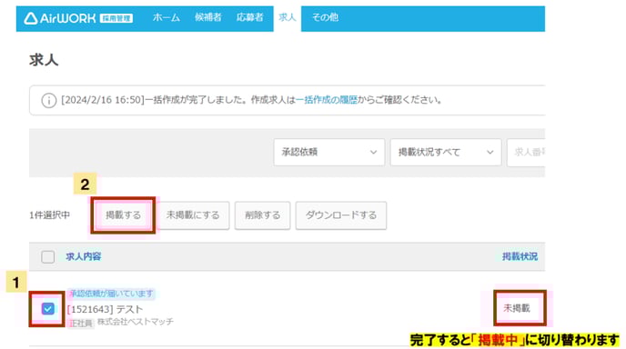 求人画面の掲載状況が「掲載中」に切り替われば、掲載開始となります。