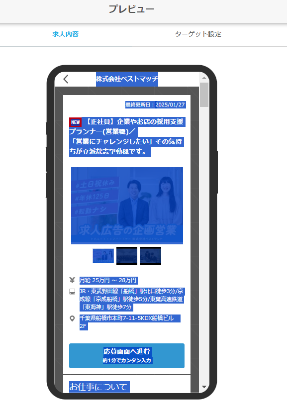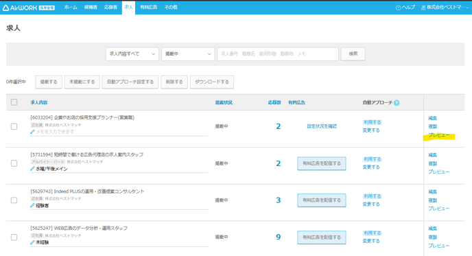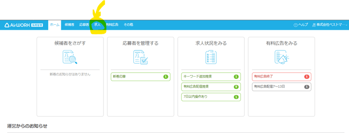 ①Airワーク 採用管理にログイン/求人タブをクリック